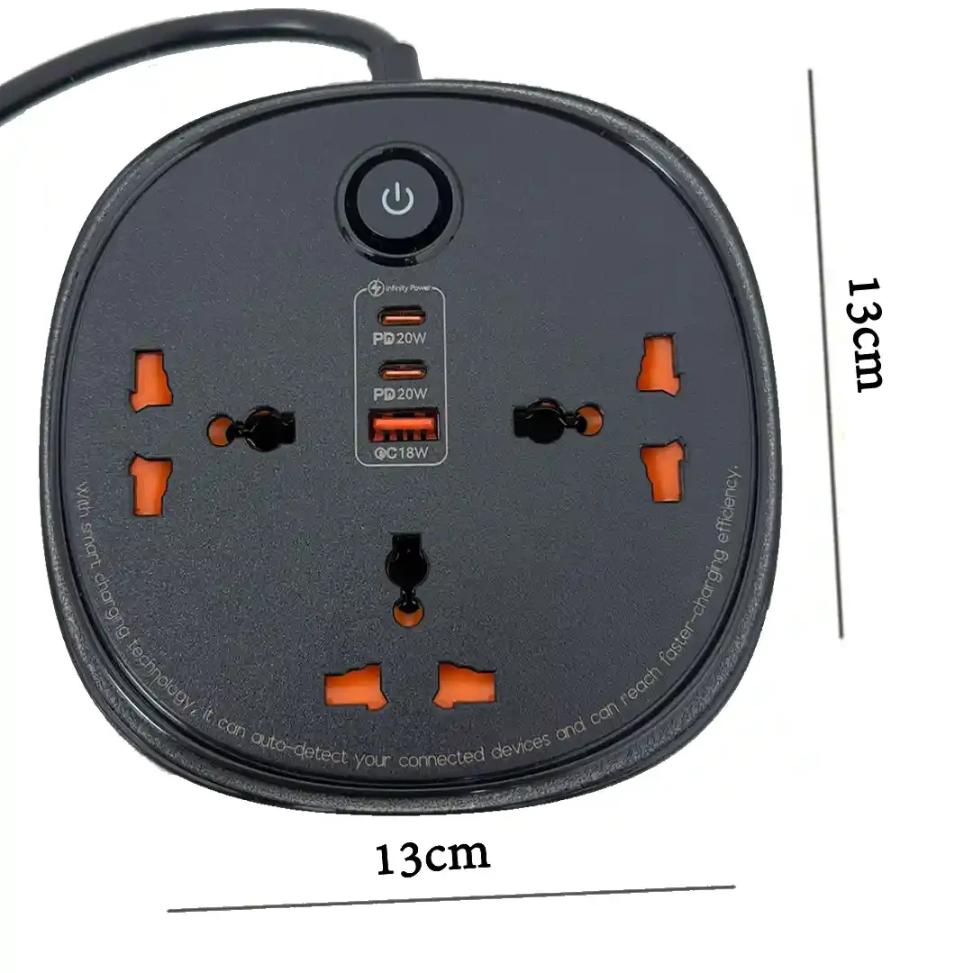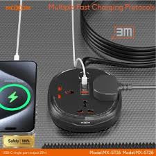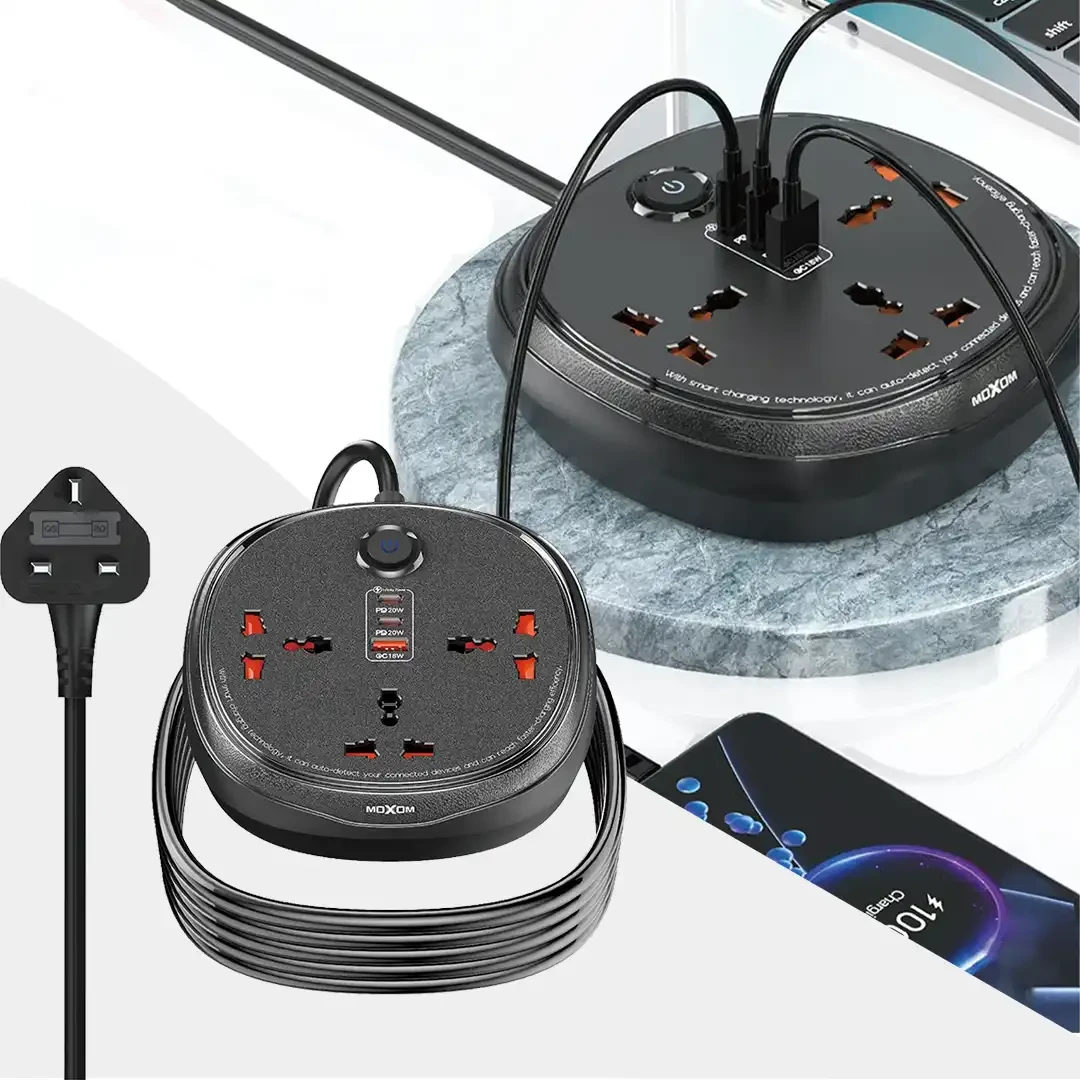 موزع الكهرباء والشحن الذكي MX-ST26 من موكسوم يأتي الموزع بـ: ■ 1 منفذ USB QC3.0 بقوة (18W). ■ 2 منفذ PD Type-C بقوة 20W. ■ 3 مقابس كهرباء (2500W). ■ حماية من الفولتيه الزائدة ومصنوع من مواد ضد الحريق، AC100-240V, 50-60Hz, 10A/2500W ■ طول سلك الكهرباء: 3 متر