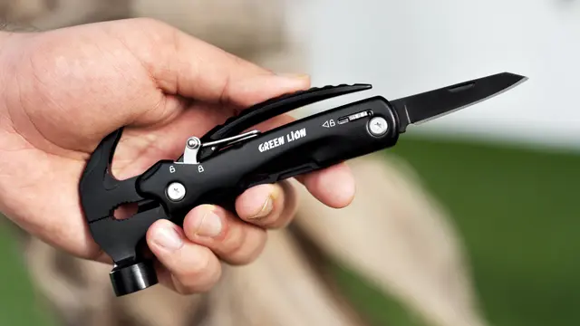 تتضمن ١٢ أداة مثل مطرقة، وشفرة سكين، ومنشار، وفتاحة زجاجات، ومفك براغي، وغيرها.