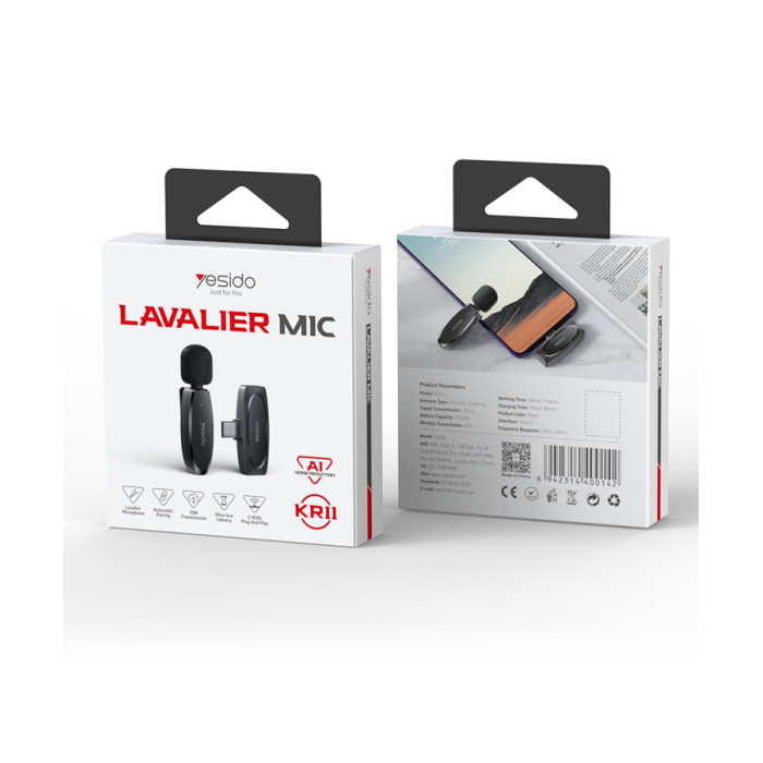 ميكروفون Yesido KR11 المحمول، مع خاصية تقليل الضوضاء، ونقل لاسلكي، واستقبال صوتي بزاوية 360 درجة، ومنفذ إرسال من النوع C، وميكروفون MEMS لاسلكي. الميزات: مستقبل اتصال من النوع C. ميكروفون MEMS. تردد 2.4 جيجاهرتز. وقت النقل: 20 مللي ثانية. بطارية الميكروفون: 70 مللي أمبير/ساعة. مدة العمل: حوالي 7 ساعات. المدى اللاسلكي: 20 مترًا.